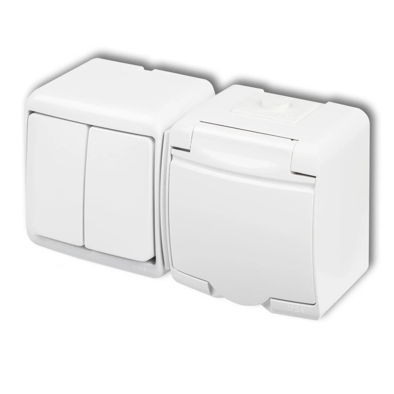 Zestaw WGHH-2s to komplet osprzętu elektroinstalacyjnego stanowiący zestawienie gniazdka elektrycznego z bolcem schuko i klapką w kolorze obudowy oraz łącznika dwuklawiszowego świecznikowego. WGHH-2s to biała wersja kolorystyczna, podobne zestawienia występują też w wersji brązowej, grafitowej bądź szarej. Elementy elektryczne ustawione są w linii poziomej w kolejności: wyłącznik - kontakt. Gniazdo z uziemieniem na dole nie posiada przesłon torów pradowych, ale wyróżnia się odpornością na bryzgi wody i zwiększone zapylenie. Wyłącznik świecznikowy może sterować oświetleniem dwustrefowym. Jednym przyciskiem możesz zapalać światło w jednym miejscu, a drugim w innym. Komplet w postaci gniazda z wyłącznikiem światła podwójnym przeznaczony jest do montażu natynkowego. Model idealny do wykorzystania w przemyśle, małych warsztatach, magazynach czy w innych pomieszczeniach gospodarczych ( piwnice, kotłownie, pracownie, przechowalnie).