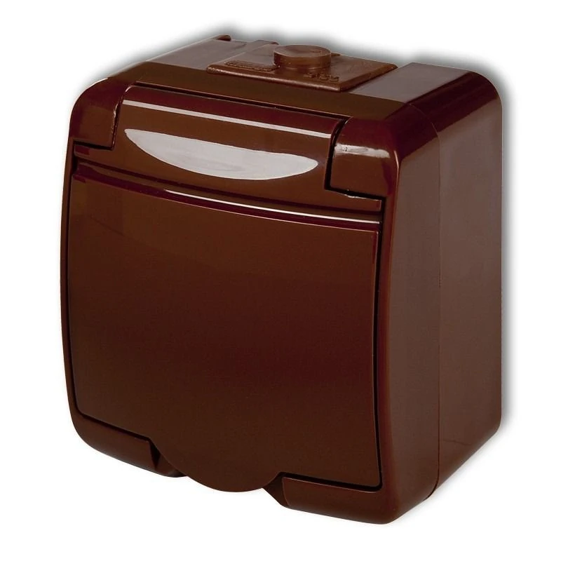 Pojedyncze gniazdo natynkowe 4GHE-1p to osprzęt w kolorze brązowym z hermetycznej serii JUNIOR. Gniazdo hermetyczne wyposażone jest w ruchomą klapkę w kolorze brązowym. Stopień szczelności IP54 pozwala wykorzystać produkt w pomieszczeniach technicznych lub pomieszczeniach gospodarczych. Idealne jako źródło zasilania w piwnicach, garażach czy na tarasach przed domem. Gniazdo 4GHE-1 posiada dwa otwory na przewód fazowy i neutralny oraz uziemienie. Gniazdko z klapką posiada również przesłony torów prądowych. Produkt posiada ochronną klapkę - idealne zabezpieczenie, w miejscach, w których przebywają dzieci.