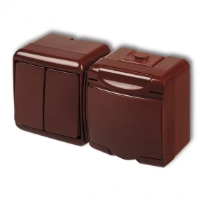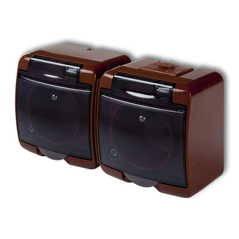 Podwójne gniazdo elektryczne to brązowe gniazdo naścienne z dymnymi klapkami osłaniającymi. Gniazdo dwukrotne 4GHE-2 z uziemieniem nie posiada przesłony torów prądowych. Kontakt elektryczny wykonany został z trwałego tworzywa ASA, odpornego na zarysowania i działanie czynników zewnętrznych. 4GHE-2d to przedstawiciel natynkowej serii JUNIOR KARLIK o właściwościach bryzgoszczelnych. Gniazdko wtyczkowe idealne do montażu w utrudnionych warunkach np. na tarasie, w ogródkach działkowych, w piwnicach czy garażach.