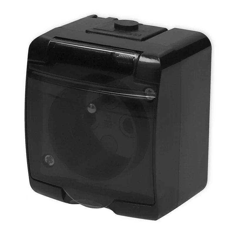 Czarne gniazdo hermetyczne natynkowe z klapką dymną z przesłonami torów JUNIOR 12GHE-1dp KARLIK