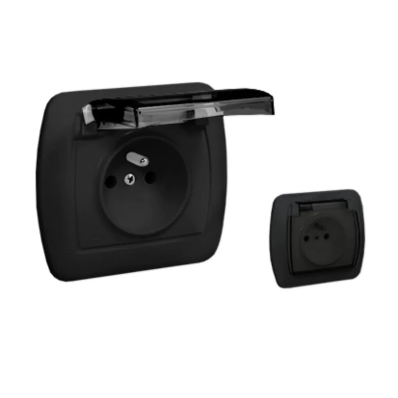 Gniazdo wtyczkowe z uziemieniem, bryzgoszczelne IP44, klapka transparentna, 16A, 250V, zaciski śrubowe; czarny mat