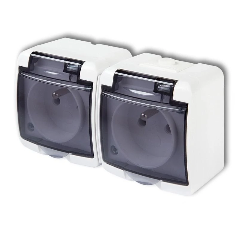 Popielaty włącznik podwójny z gniazdem hermetycznym w pionie 10WGHP-2p JUNIOR KARLIK
