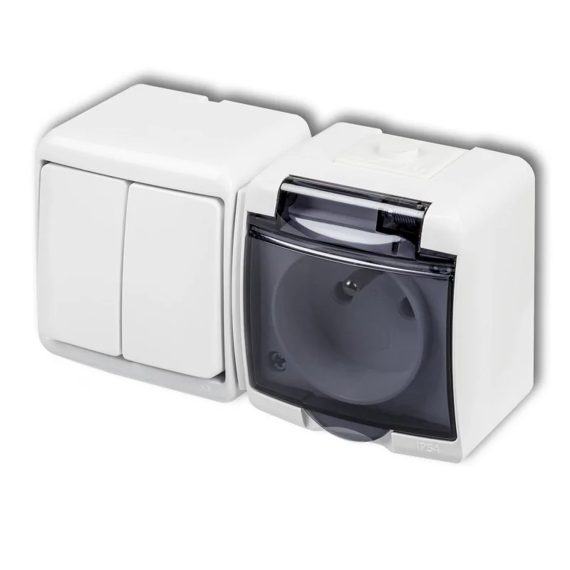 Zestaw WGHH-2d to komplet osprzętu elektroinstalacyjnego stanowiący zestawienie gniazdka elektrycznego z bolcem i klapką transparentną. Elementy elektryczne ustawione są w linii poziomej w kolejności: wyłącznik - kontakt. Gniazdo z uziemieniem nie posiada przesłon torów pradowych, ale wyróżnia się odpornością na bryzgi wody i zwiększone zapylenie. Wyłącznik świecznikowy może sterować oświetleniem dwustrefowym. Jednym przyciskiem możesz zapalać światło w jednym miejscu, a drugim w innym. Komplet w postaci gniazda z wyłącznikiem światła podwójnym przeznaczony jest do montażu natynkowego. Model idealny do wykorzystania w przemyśle, małych warsztatach, magazynach czy w innych pomieszczeniach gospodarczych ( piwnice, kotłownie, pracownie, przechowalnie).