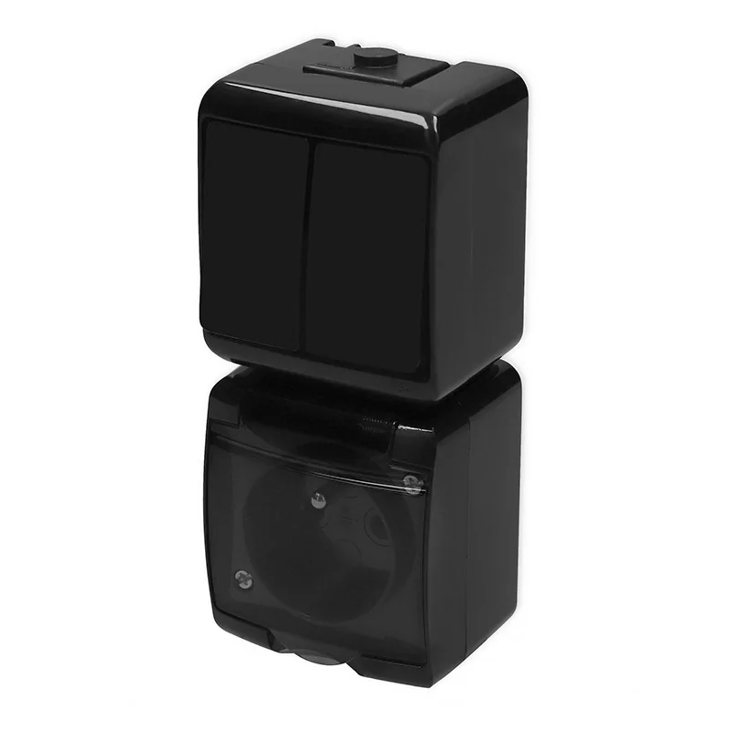 Zestaw 12WGHP-2dp to pionowy mix, będący połączeniem łącznika świecznikowego z gniazdkiem hermetycznym zamykanym przydymioną klapką. 12WGHP-2dp to wariant w kolorze czarnym odpornej na blaknięcie. Zestaw w orientacji pionowej ( góra - włącznik podwójny, dół - kontakt bryzgoszczelny) pochodzi z linii JUNIOR wypuszczonej na rynek przez KARLIK- polskiego producenta osprzętu elektroinstalacyjnego. Komplet przeznaczony jest do montażu natynkowego. Gniazdo w mixie posiada bolec uziemiający oraz osłony styków prądowych. Wyłącznik podwójny umieszczony nad gniazdem może zostać wykorzystany do załączania oświetlenia np. w żyrandolach podzielonych na dwie strefy. Model idealny do wykorzystania w przemyśle, małych warsztatach, magazynach czy w innych pomieszczeniach gospodarczych, gdzie istnieje duże prawdopodobieństwo zapylenia i zawilgocenia otoczenia.