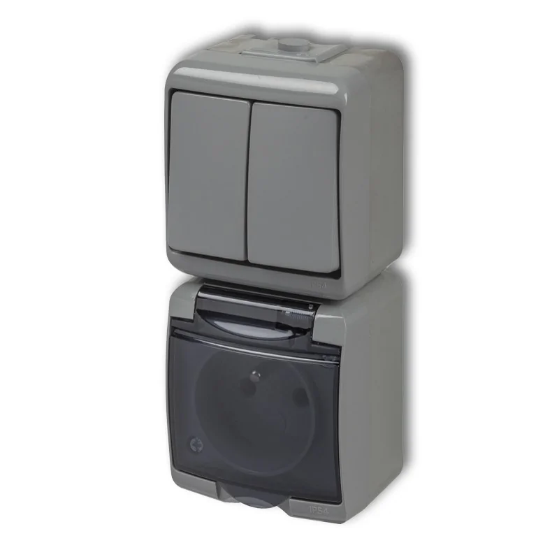 Zestaw 10WGHP-2d to pionowy mix, będący połączeniem łącznika świecznikowego z gniazdkiem hermetycznym zamykanym dymną klapką. 10WGHP-2d to wariant w kolorze szarym odpornym na blaknięcie. Zestaw w orientacji pionowej ( góra - włącznik podwójny, dół - kontakt bryzgoszczelny) pochodzi z linii JUNIOR wypuszczonej na rynek przez KARLIK- polskiego producenta osprzętu elektroinstalacyjnego. Komplet przeznaczony jest do montażu natynkowego. Gniazdo w mixie posiada bolec uziemiający, nie posiada natomiast osłony styków prądowych. Wyłącznik podwójny umieszczony nad gniazdem może zostać wykorzystany do załączania oświetlenia np. w żyrandolach podzielonych na dwie strefy. Model idealny do wykorzystania w przemyśle, małych warsztatach, magazynach czy w innych pomieszczeniach gospodarczych, gdzie istnieje duże prawdopodobieństwo zapylenia i zawilgocenia otoczenia.