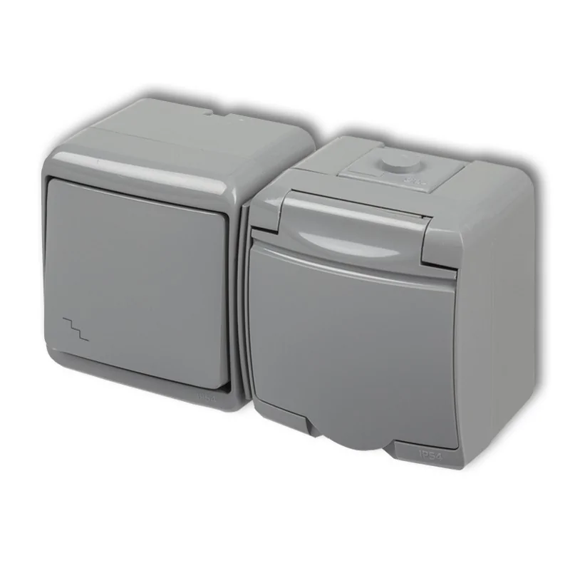 Zestaw 10WGHH-3 to mix elementów elektroinstalacyjnych łączących w sobie gniazdko elektrycznego z uziemieniem i klapką w kolorze obudowy oraz łącznik schodowy z jednym klawiszem. 10WGHH-3 to popielata wersja kolorystyczna. Podobne zestawienia występują też w wersji białej, grafitowej bądź brązowej. Połączenie osprzętu w linii poziomej w kolejności: wyłącznik - kontakt ułatwia montaż i organizację pracy oraz wpływa na estetykę wyglądu ścian z instalacją. Gniazdo w komplecie 10WGHH-3 z uziemieniem nie posiada przesłon styków. Wyłącznik klatkowy pozwala na włączanie i wyłączanie światła z dwóch rożnych miejsc np. na klatce, korytarzu czy dużej sali lub hali. Komplet pochodzi z hermetycznej linii JUNIOR przeznaczonej do montażu natynkowego zarówno w domach, jak i w zastosowaniach przemysłowych.
