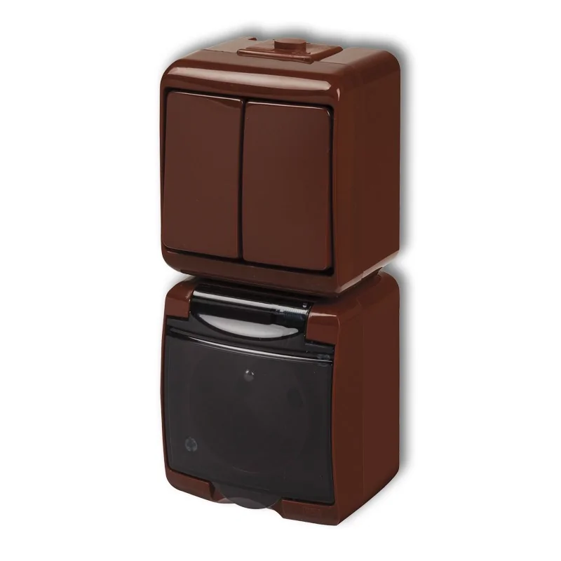 Zestaw 4WGHP-2d to pionowy mix, będący połączeniem łącznika świecznikowego z gniazdkiem hermetycznym zamykanym dymną klapką. 4WGHP-2d to wariant w kolorze brązu odpornego na blaknięcie. Zestaw w orientacji pionowej ( góra - włącznik podwójny, dół - kontakt bryzgoszczelny) pochodzi z linii JUNIOR wypuszczonej na rynek przez KARLIK- polskiego producenta osprzętu elektroinstalacyjnego. Komplet przeznaczony jest do montażu natynkowego. Gniazdo w mixie posiada bolec uziemiający, nie posiada natomiast osłony styków prądowych. Wyłącznik podwójny umieszczony nad gniazdem może zostać wykorzystany do załączania oświetlenia np. w żyrandolach podzielonych na dwie strefy. Model idealny do wykorzystania w przemyśle, małych warsztatach, magazynach czy w innych pomieszczeniach gospodarczych, gdzie istnieje duże prawdopodobieństwo zapylenia i zawilgocenia otoczenia.