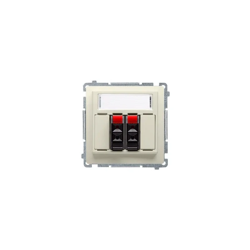 Gniazdo głośnikowe 2-krotne z polem opisowym (moduł). Przekrój przew.dla wejścia i wyjścia 2,5 mm2. Mocowanie na łapki i wkręty; beż