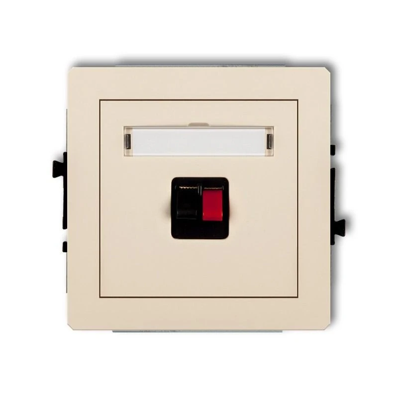 Gniazdo głośnikowe pojedyncze serii DECO firmy KARLIK w kolorze beżowym, przeznaczone do montażu podtynkowego. Gniazdo wymaga dokupienia ramki serii DECO firmy KARLIK.