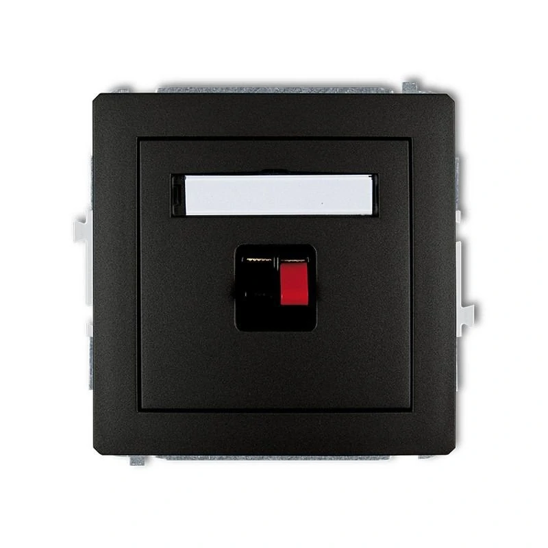 Mechanizm gniazda głośnikowego pojedynczego koloru czarnego serii DECO firmy KARLIK, przeznaczone do montażu podtynkowego. Gniazdo wymaga dokupienia ramki serii DECO firmy KARLIK.