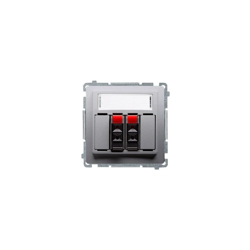 Gniazdo głośnikowe 2-krotne z polem opisowym (moduł). Przekrój przew.dla wejścia i wyjścia 2,5 mm2. Mocowanie na łapki i wkręty; srebrny mat