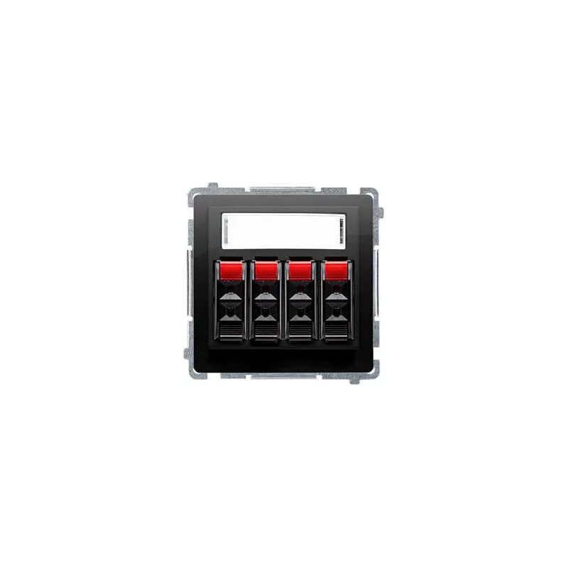 Gniazdo głośnikowe 4-krotne z polem opisowym (moduł). Do podłączenia 4 kolumn głośnikowych. Mocowanie gniazda na łapki i wkręty. Gniazdo w kolorze czarny mat przeznaczone jest do montażu podtynkowego. Do gniazda należy dokupić standardową ramkę instalacyjną serii Simon Basic.