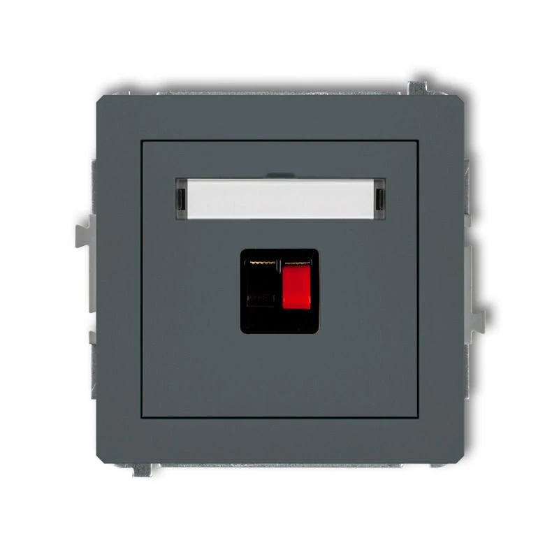 Gniazdo głośnikowe pojedyncze serii DECO firmy KARLIK w kolorze grafitowym matowym, przeznaczone do montażu podtynkowego. Gniazdo wymaga dokupienia ramki serii DECO firmy KARLIK.