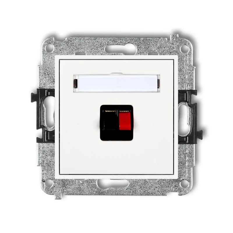 Mechanizm gniazda pojedynczego głośnikoweho MINI firmy KARLIK, przeznaczonego do montażu podtynkowego; wymaga dokupienia ramki serii MINI firmy KARLIK. Gniazdo wyposażone jest w jedno wejście 2,5mm2. Gniazdo do podłączenia głośników pomoże Ci stworzyć w domu profesjonalną sieć audio z doskonałym dźwiękiem odtwarzanej przez Ciebie muzyki. Gniazdo głośnikowe przeznaczone jest do instalacji podtynkowej za pomocą tzw. pazurków montażowych. Gniazdo to zagwarantuje Ci doskonałe podpięcie głośników w Twoim domu, bez tracenia jakości dźwięku spowodowanej montażem dodatkowych kabli lub przejściówek. Dzięki modelowi MGG-1 możesz jeszcze bardziej docenić wartość filmów z doskonałą ścieżką dźwiękową lub na nowo odkryć radość z słuchania ulubionych przebojów.