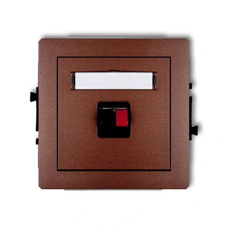 Gniazdo głośnikowe pojedyncze w kolorze brązowym serii DECO firmy KARLIK, przeznaczone do montażu podtynkowego. Gniazdo wymaga dokupienia ramki serii DECO firmy KARLIK.