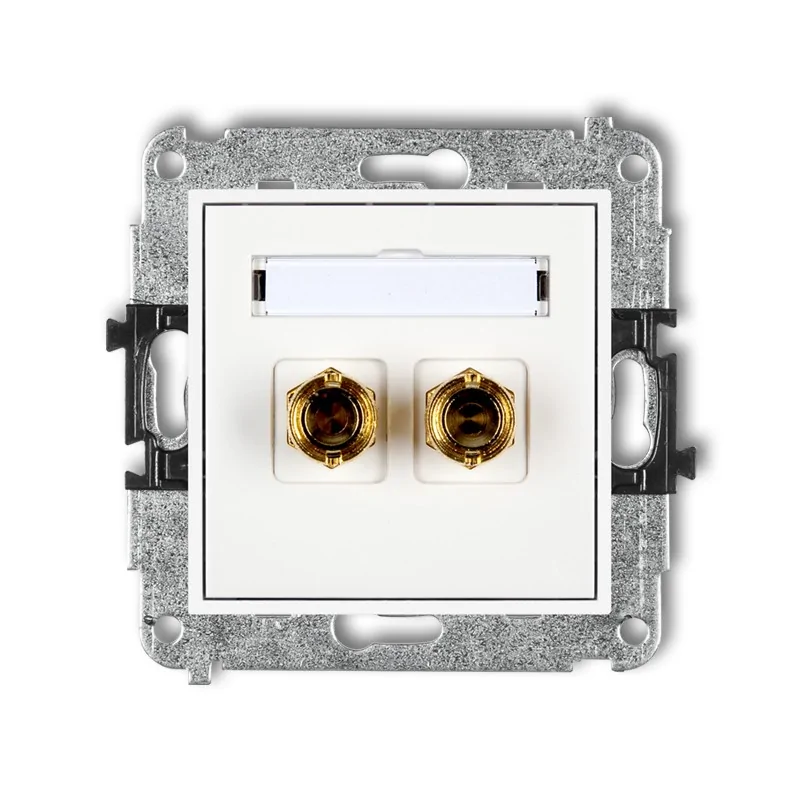 Mechanizm gniazda podwójnego głośnikowego MINI firmy KARLIK, przeznaczonego do montażu podtynkowego; wymaga dokupienia ramki serii MINI firmy KARLIK.