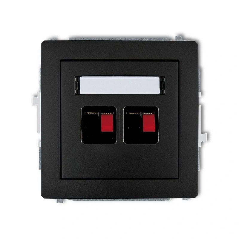 Podwójne gniazdo głośnikowe w kolorze czarnym serii DECO firmy KARLIK, przeznaczone do montażu podtynkowego. Gniazdo wymaga dokupienia ramki serii DECO firmy KARLIK.