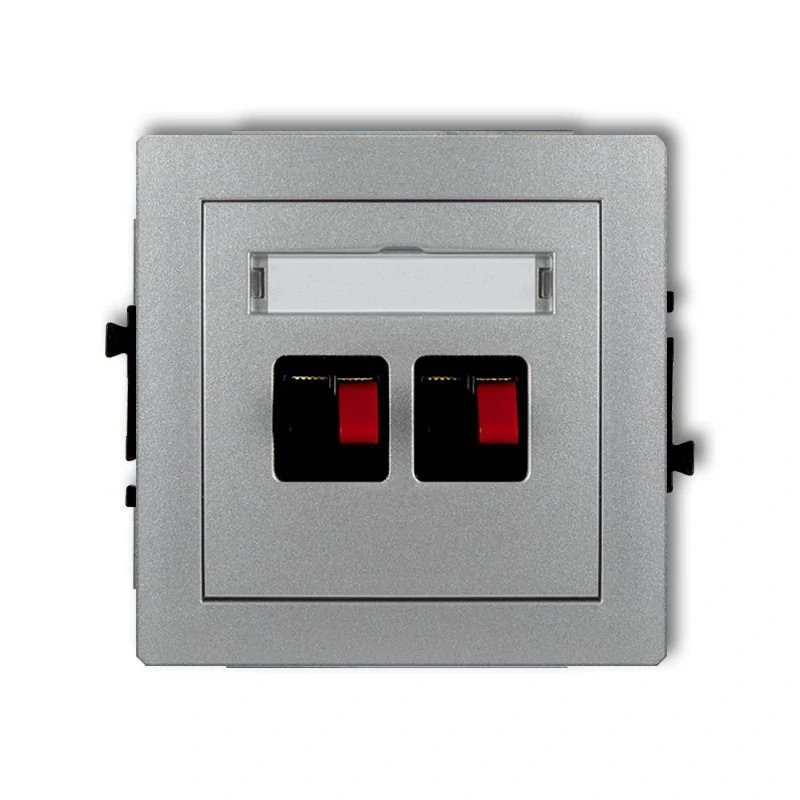 Podwójne gniazdo głośnikowe w kolorze srebrnym serii DECO firmy KARLIK, przeznaczone do montażu podtynkowego. Gniazdo wymaga dokupienia ramki serii DECO firmy KARLIK.