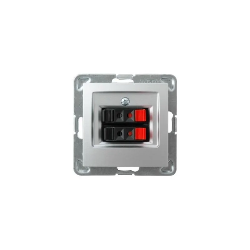 Podwójne gniazdo głośnikowe serii IMPRESJA firmy OSPEL koloru srebrnego, dostosowane do montażu podtynkowego. Gniazdo wymaga dokupienia ramki z serii IMPRESJA firmy OSPEL.
