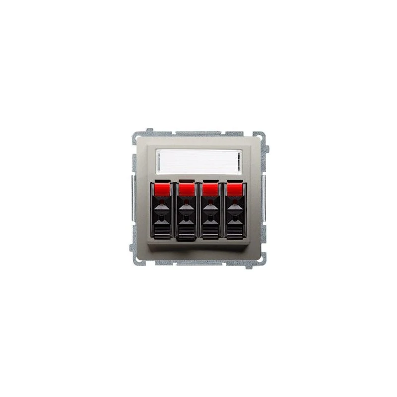 Gniazdo głośnikowe 4-krotne z polem opisowym (moduł). Do podłączenia 4 kolumn głośnikowych. Mocowanie gniazda na łapki i wkręty; satynowy