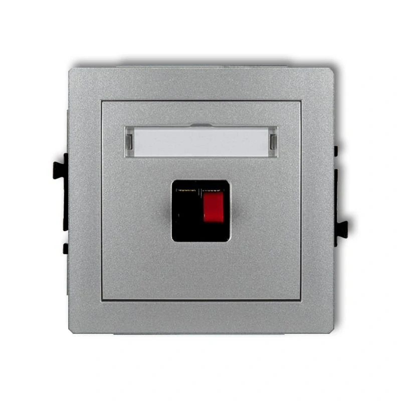 Gniazdo głośnikowe serii DECO firmy KARLIK, w kolorze srebrnym, przeznaczone do montażu podtynkowego. Gniazdo wymaga dokupienia ramki serii DECO firmy KARLIK.