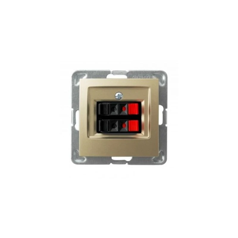 Podwójne gniazdo głośnikowe serii IMPRESJA firmy OSPEL w kolorze złotym jest przystosowane do montażu podtynkowego. Gniazdo wymaga dokupienia ramki z serii IMPRESJA firmy OSPEL.
