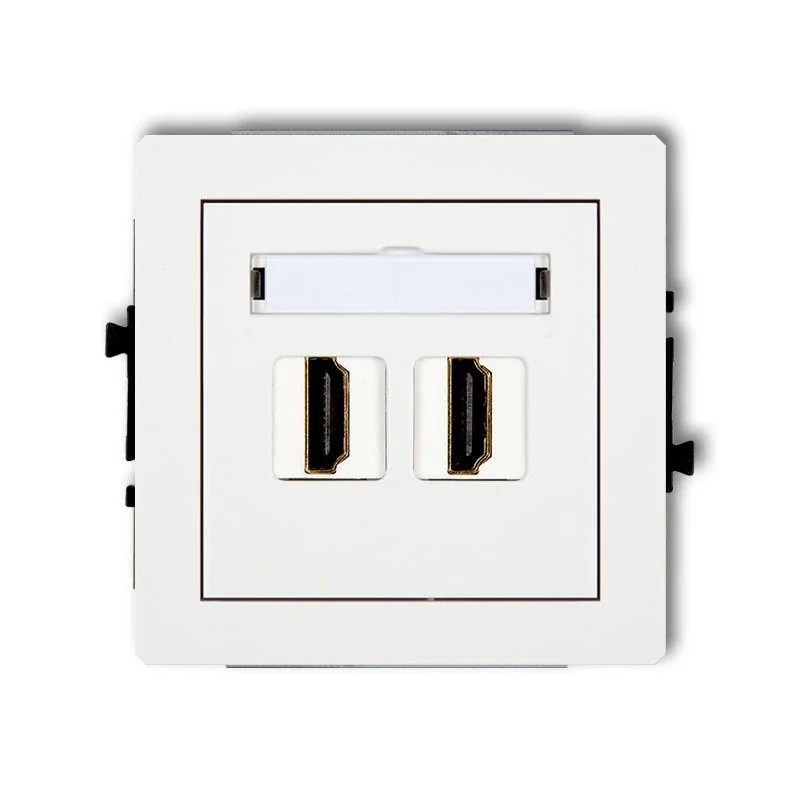 Podwójne gniazdo HDMI w kolorze białym serii DECO firmy KARLIK, przeznaczone do montażu podtynkowego. Gniazdo wymaga dokupienia ramki serii DECO firmy KARLIK.