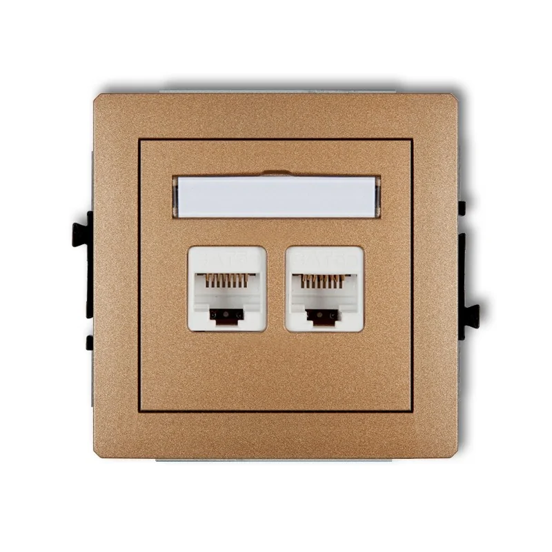 Podwójne gniazdo komputerowe RJ45 kat. 6e w kolorze złotym serii DECO firmy KARLIK, przeznaczone do montażu podtynkowego. Gniazdo sprzedawane jest bez ramki w zestawie. W serii DECO dostępne są ramki w krotnościach 1-5 w różnych kolorach. W ofercie znajdują się również ramki wypełniające- niweluje szczelinę pomiędzy ramką standardową, a ścianą (opcja dodatkowa) oraz pośrednie w bogatej kolorystyce, co pozwala na stworzenie własnej kompozycji.