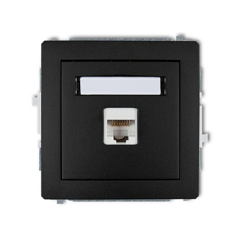 Mechanizm gniazda pojedynczego komputerowego RJ45 serii DECO firmy KARLIK, przeznaczonego do montażu podtynkowego; wymaga dokupienia ramki serii DECO firmy KARLIK.