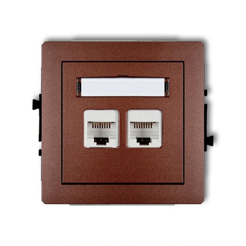 Podwójne gniazdo komputerowe RJ45 serii DECO firmy KARLIK w kolorze brązowym, przeznaczone do montażu podtynkowego. Gniazdo wymaga dokupienia ramki serii DECO firmy KARLIK.