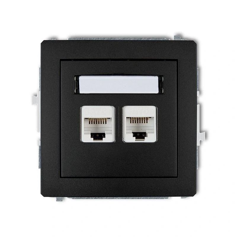 Podwójne gniazdo komputerowe RJ45 kat. 5e pw kolorze czarnym serii DECO firmy KARLIK, przeznaczone do montażu podtynkowego. Gniazdo wymaga dokupienia ramki serii DECO firmy KARLIK.