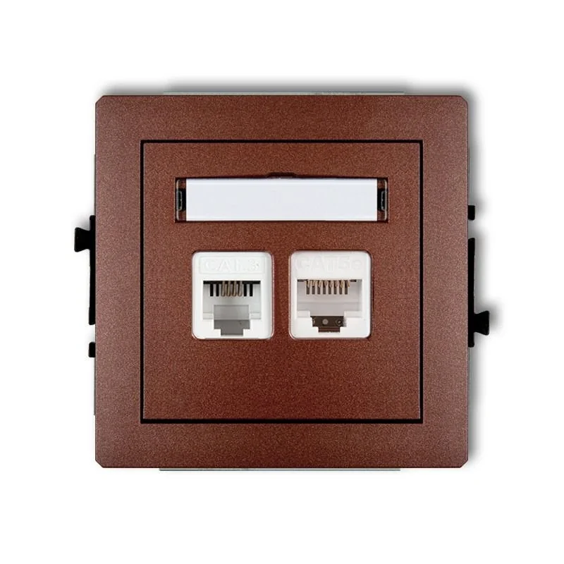 Gniazdo telefoniczne RJ11+komputerowe RJ45 w kolorze brązowym serii DECO firmy KARLIK, przeznaczone do montażu podtynkowego. Gniazdo wymaga dokupienia ramki serii DECO firmy KARLIK.