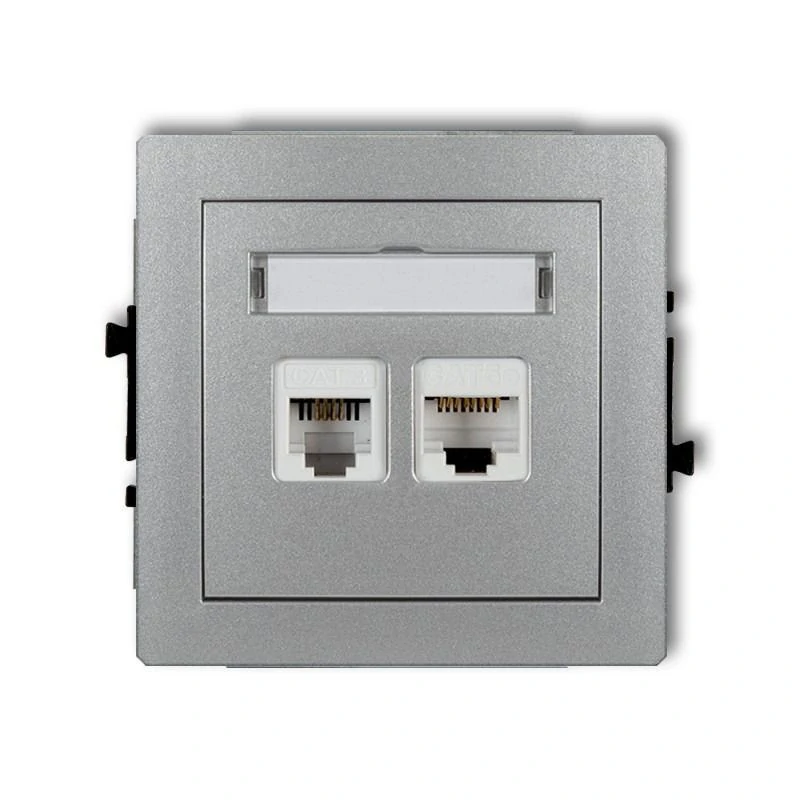 Gniazdo telefoniczne RJ11 i komputerowe RJ45 koloru srebrnego serii DECO firmy KARLIK, przeznaczone do montażu podtynkowego. Gniazdo wymaga dokupienia ramki serii DECO firmy KARLIK.