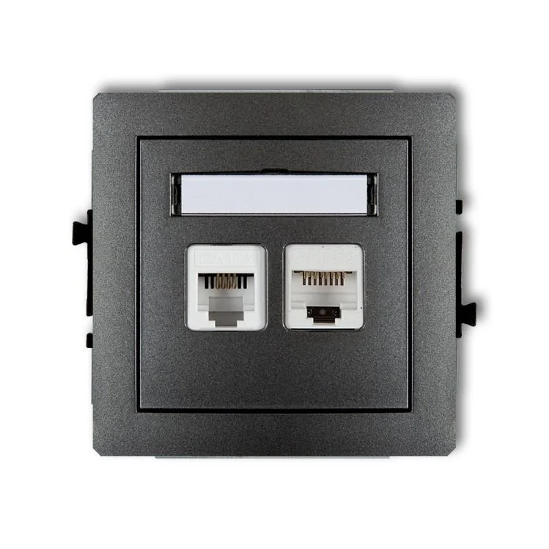 Gniazdo telefoniczne RJ11 i komputerowe RJ45 w kolorze grafitowym serii DECO firmy KARLIK, przeznaczone do montażu podtynkowego. Gniazdo wymaga dokupienia ramki serii DECO firmy KARLIK.
