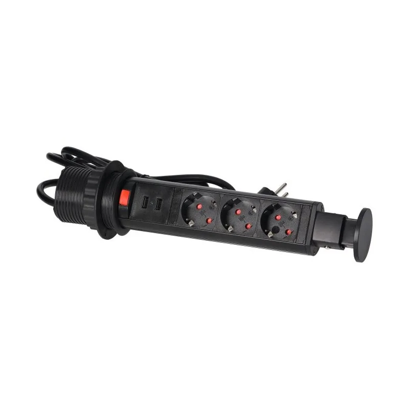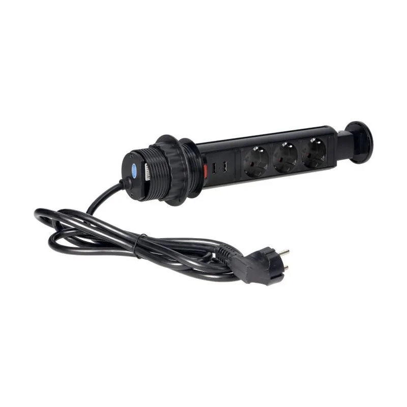 Czarne gniazdo blatowe wysuwane z ładowarką USB i przewodem 3x2P+Z OR-AE-1349/B ORNO