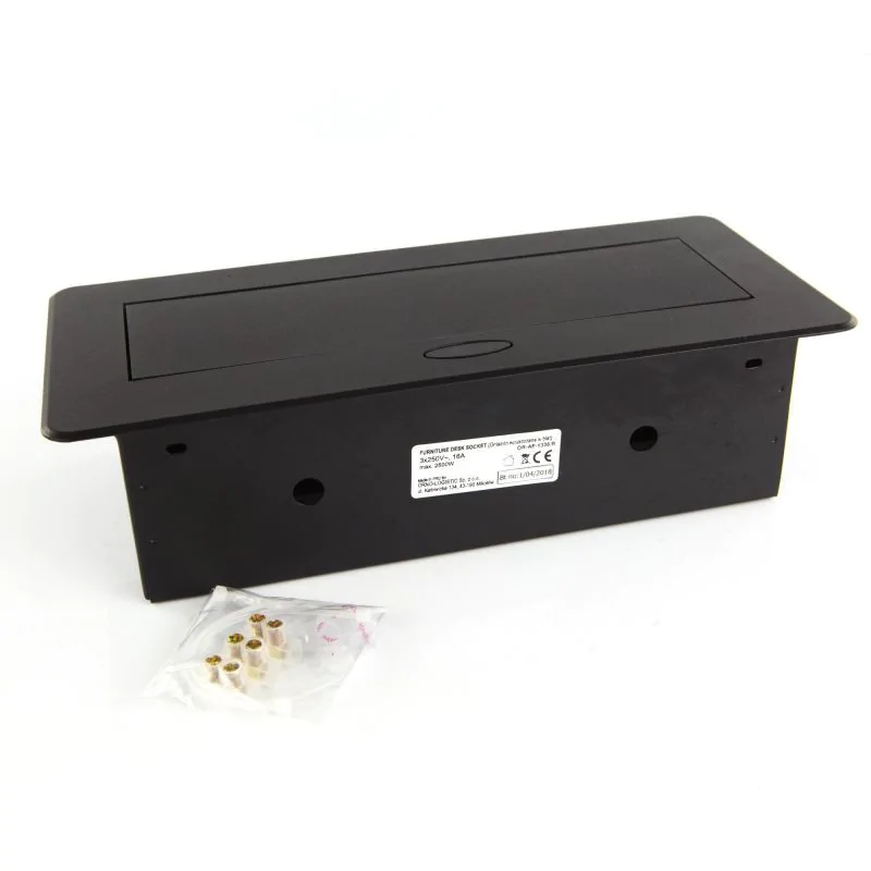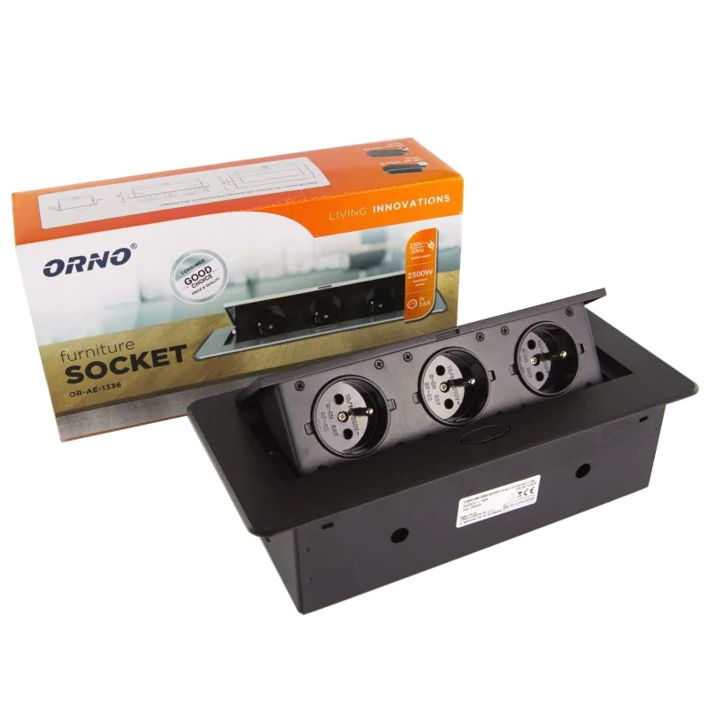 Gniazdo blatowe OR-AE-1336/B w kolorze czarnym z płaskim frezowanym rantem, firmy ORNO. Gniazda wpuszczane to idealne rozwiązanie do użytku biurowego, w salach konferencyjnych, jak i w domu. Mechanizm gniazd umieszczony w blacie biurka lub stołu rozwiązuje problem sięgania do źródła zasilania na ziemie, mając gniazdka zawsze pod ręką w wygodnym miejscu. Po naciśnięciu przycisku wysuwa się panel z trzema gniazdami zasilającymi. Gdy gniazdo jest schowane komponuje się całkowicie z powierzchnią stołu, dzięki czemu biurko jest estetyczne. Do dyspozycji mamy trzy kontakty z uziemieniem, do których jednocześnie możemy podłączyć urządzenia o łącznej mocy 2500W. Mechanizm gniazd wpuszczanych posiada stopień ochrony IP20. Brak kabla zasilającego w zestawie
