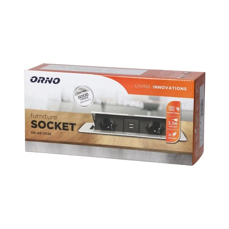 Gniazdo meblowe marki ORNO, wpuszczane w blat ma czarną podstawę oraz pokrywę w kolorze mosiądzu. Jest to zestaw dwóch gniazd sieciowych z uziemieniem i przesłonami torów prądowych, połączonych z ładowarką USB w obudowie chowanej w blat. Urządzenie przeznaczone jest do montażu w biurkach, blatach i stołach, może być zamontowane zarówno w pozycji pionowej jak i poziomej, zapewniając wygodny dostęp do gniazd elektrycznych. Dzięki płaskiemu rantowi (zaledwie 2 mm) obudowa z gniazdami doskonale wpasowuje się w płaszczyznę np. stołu i nie przeszkadza w jego czyszczeniu. Zestaw posiada fabrycznie zamontowany kabel o długości 1,5m. Ten model gniazda blatowego dostępny jest w różnych kolorach.