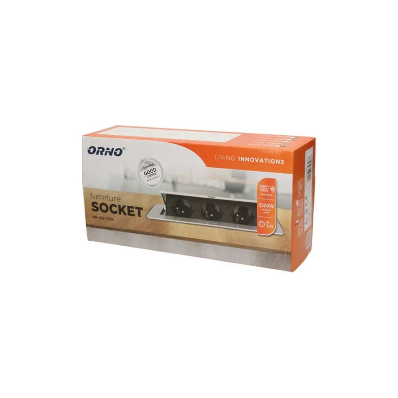 Gniazdo meblowe wpuszczane w blat OR-AE-1336/G(GS) firmy ORNO posiada zamykany panel z trzema gniazdami schuko. Produkt idealnie spisze się w salach konferencyjnych, gwarantując brak widoku zbędnych gniazd oraz kabli. Gniazdo blatowe zostało wyposażone w płaski frezowany rant o grubości 2 mm. Do gniazda mogą być podłączone trzy urządzenia o maksymalnej mocy łącznie 2500W. Urządzenie przeznaczone jest do montażu w blatach, biurkach oraz stołach. Zalecany przewód to OWY 3 × 1,5 mm², którego brak w zestawie.