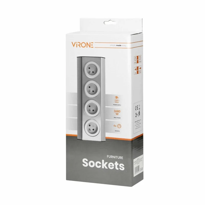 Zestaw czterech gniazd sieciowych FS-2(GS) producenta ORNO, w wersji SCHUKO, z uziemieniem, który idealnie nadaje się do montażu w kuchni i biurze, na powierzchniach płaskich i w narożnikach. Prosty i szybki montaż na rzepy, sprawia łatwość każdemu użytkownikowi i zapewnia stabilne mocowanie do powierzchni bez konieczności wiercenia i przykręcania. Obudowa gniazda meblowego wykonana ze stali nierdzewnej INOX charakteryzuje się wysoką odpornością i eleganckim wyglądem. Zestaw gniazd posiada przewód o długości 1,5m zakończony płaską wyczką.