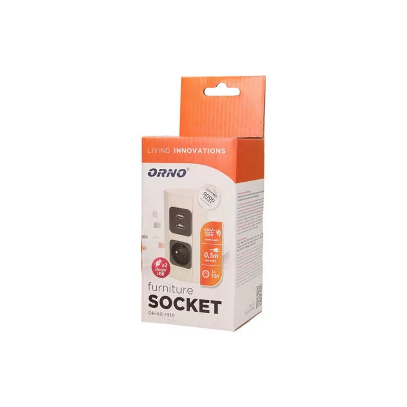 Gniazdo meblowe podszafkowe OR-AE-1310 firmy ORNO posiada srebrną obudowę wykonaną z wysokiej jakości aluminium i tworzywa sztucznego. Cały produkt składa się z jednego gniazda sieciowego z uziemieniem i przesłonami torów prądowych oraz dwóch portów USB. Napięcie wyjściowe ładowarki USB wynosi 5VDC / 2,1A. Prezentowany model gniazda meblowego wyposażony został w przewód o długości 0,5m. Do produktu można podłączyć urządzenia o maksymalnej łącznej mocy 3680W. Wymiary gniazda meblowego to: 150 x 64 x 64 mm.