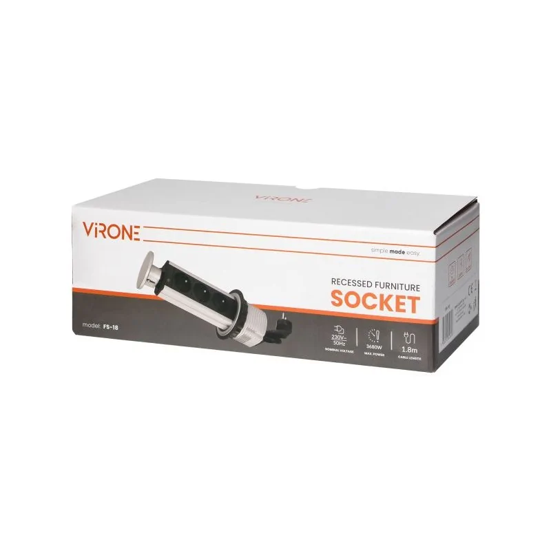 Dyskretne i funkcjonalne potrójne gniazdo meblowe VIRONE marki ORNO, pozwala nam na jednoczesne podłączenie 3 urządzeń 230V, o łącznej mocy do 3680W. Ergonomiczny montaż poprzez pojedynczy otwór o średnicy 80mm w blacie, biurku lub ściance mebla zapewnia oszczędność miejsca i estetyczny wygląd. System wysuwania listwy jednym kliknięciem oszczędzi sporo miejsca i czasu zmarnowanego na przepinanie kabli, wpinanie i wypinanie rozdzielaczy i manewry mające na celu utrzymanie jako takiego w nich porządku. Wyposażony we własny kabel zasilający o długości 1,8m. Kabel zakończony jest wtyczką, co pozwala bezpiecznie, szybko i łatwo połączyć listwę przyłączeniową ze źródłem prądu.
