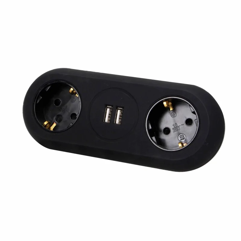Gniazdo meblowe OR-AE-13133(GS)/B w wersji SCHUKO, z uchwytem montażowym i ładowarką do wszelkiego rodzaju urządzeń mobilnych, ładowanych przez port USB np. tablety, smartfony. Urządzenie marki ORNO, posiada dwa gniazda sieciowe SCHUKO z uziemieniem i przesłonami torów prądowych, dwa porty ładowarki USB, elastyczny przewód o długości 1,4 m oraz zacisk śrubowy, który umożliwia przytwierdzenie podstawy gniazd do krawędzi blatu biurka lub półki, bez konieczności wiercenia otworów montażowych. Możemy podłączyć urządzenia, które łącznie nieprzekraczające mocy 2300W. Produkt objęty gwarancją producenta.