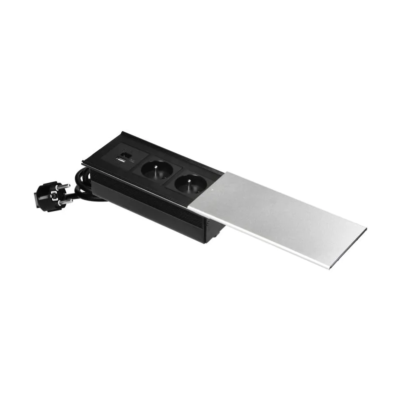 Gniazdo meblowe z przesuwną klapką to nowoczesne rozwiązanie do ładowania urządzeń mobilnych. Zamknięte w minimalistycznym srebrnym korpusie oferuje użytkownikowi wygodny dostęp do prądu integrując się jednocześnie z nowoczesnymi wnętrzami.