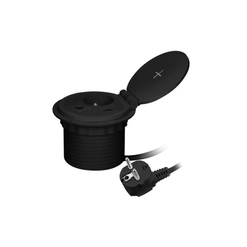 Gniazdo meblowe wpuszczane w blat OR-GM-9015/B marki ORNO w kolorze czarnym to wpuszczane gniazdo meblowe, które świetnie dopasuje się do każdego blatu kuchennego, stołu czy biurka. Produkt został wyposażony w jedno gniazdo sieciowe z uziemieniem, ładowarkę indukcyjną, szybką ładowarkę USB z wejsćiem A i C oraz dodatkowy wymienny moduł, który można zastąpić innym moduem funckyjnym