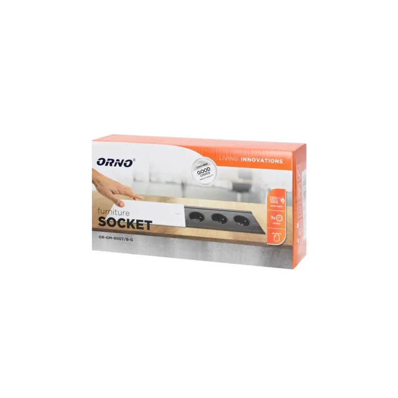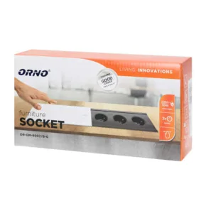 Gniazdo blatowe OR-GM-9007/B-G firmy ORNO jest w czarno-srebrnym kolorze, który świetnie będzie współgrać z każdym blatem, biurkiem czy stołem. Produkt wyposażony został w przesuwaną pokrywkę oraz trzy gniazda z uziemieniem i przesłonami torów prądowych. Gniazdo meblowe znajdzie szerokie zastosowanie w biurze, salonie czy gabinecie, gdzie będzie elegancko się prezentować. Zalecanym przewodem jest OWY 3 x 1,5 mm, którego brak w zestawie. Do gniazda można podłączyć trzy urządzenia o maksymalnej mocy łącznie 3680W.