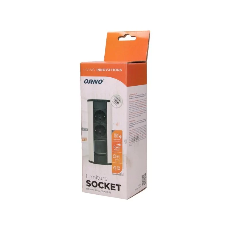 Meblowe gniazdo podszafkowe OR-GM-9002/B-G(GS) firmy ORNO jest w kolorze czarno-srebrnym i wyposażone zostało w przewód o długości 0,6 m. Produkt składa się z dwóch gniazd z uziemieniem typu Schuko i przesłonami torów prądowych oraz wyłącznika on/off. Do gniazda meblowego można podłączyć urządzenia o maksymalnej łącznej mocy 3680W. Produkt przeznaczony jest do montażu w szafkach, gablotach oraz witrynach, a jego wymiary to: 64 x 210 x 64 mm. Na stronie naszego sklepu internetowego znajdziecie różnego rodzaju gniazda meblowe wysokiej jakości.