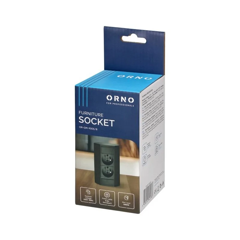 Podwójne gniazdo meblowe OR-GM-9005/B marki ORNO to estetyczne rozwiązanie, które znajdzie zastosowanie pod szafką kuchenna, w szafce, gablocie czy witrynie. Czarny kolor dopasuje się do każdego miejsca i doda mu eleganckiego klimatu. Produkt składa się z dwóch gniazd z uziemieniem i przesłonami torów prądowych. Do gniazda można podłączyć dwa urządzenia o maksymalnej łącznej mocy 3680W. Prezentowany model gniazda meblowego wyposażony został w przewód o długości 0,6m, a jego wymiary to: 64 x 151 x 64 mm. Gniazdo dostępne również w wersji Schuko i w kolorze szarym.