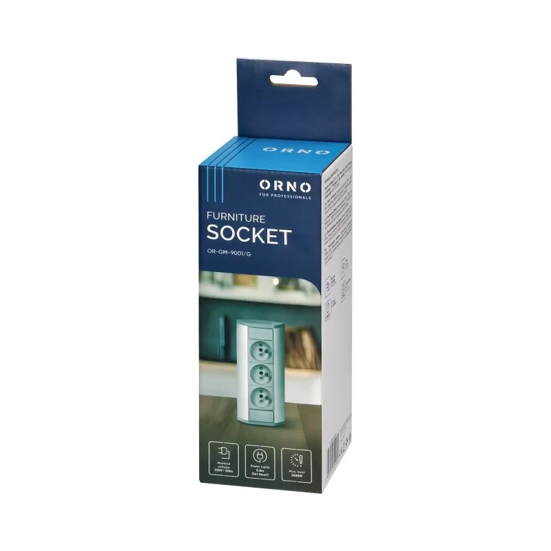 Meblowe gniazdo potrójne OR-GM-9001/G firmy ORNO, składa się z trzech gniazd sieciowych w wersji z uziemieniem i przesłonami torów prądowych. Gniazda podszafkowe to idealne rozwiązanie do montażu w szafkach, gablotach czy witrynach. Obudowa w kolorze szaro srebrnym świetnie zaprezentuje się w każdym pomieszczeniu. Produkt został wyposażony w przewód o długości 0,6 m. Gniazdo meblowe jest o wymiarach: 64 x 200 x 64 mm. Do produktu można podłączyć trzy urządzenia o maksymalnym łącznym obciążeniu 3680W.