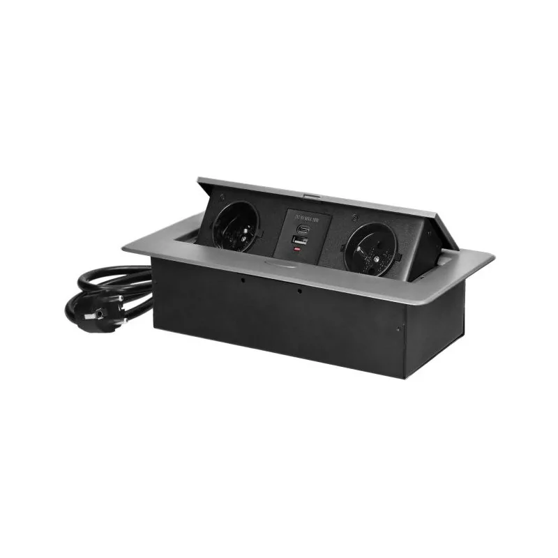 Gniazdo meblowe marki ORNO, wpuszczane w blat z płaskim, frezowanym rantem wyróżnia nie tylko minimalistyczny design, ale też funkcjonalność. Rant pozwala estetycznie zamontować kasetę gniazda, tak, aby cały otwór i linie cięć pozostały zasłonięte. Cechą wyróżniającą nowy model powerboxa jest pełna dolna zabudowa, która ułatwia montaż oraz poprawia bezpieczeństwo. Brak dostępu do gniazd sieciowych i dodatkowo osłonięty gumową uszczelką przepust kablowy chroni przed niepożądanym dostępem i uszkodzeniami mechanicznymi. Gniazdo posiada również przesłony torów prądowych, a cała obudowa pozwala zamknąć uchylną klapkę i schować nieużywane urządzenie płasko w blacie. Srebrna powierzchnia gniazda dobrze zgrywa się z wykończeniem większości mebli oraz kolorystycznie wpasują się w większość aranżacji. Dopracowany kształt sprawia, że wykorzystanie gniazda wpuszczanego w blat jest stylową alternatywą dla zwykłych przedłużaczy czy listwy zasilającej, a do tego pozwala skutecznie uniknąć splątanych kabli. Urządzenie posiada stopień ochrony IP20 i doskonale sprawdzi się w domu, biurze, recepcji, sali konferencyjnej, szkolnej pracowni, w suchych strefach kuchni lub w hotelu. Zamykane, wpuszczane w blat gniazdo umożliwia nam jednoczesne przyłączenie dwóch urządzeń, wyposażono je bowiem w dwa gniazda z uziemieniem, typu Schuko (2x2P+Z) oraz kolejnych dwóch, zasilanych z dwóch portów USB (typu A oraz C). Dopuszczalne obciążenie urządzenia to 3680W. Wyposażone w kabel o długości 1,5m - gotowe do podpięcia i użytkowania.