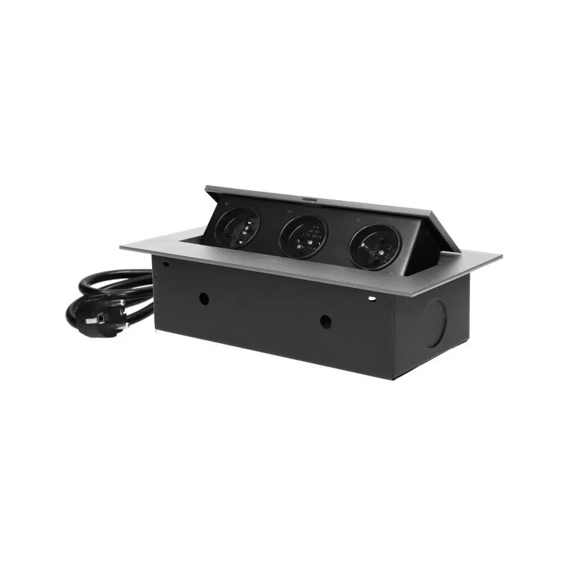 Gniazdo meblowe wpuszczane w blat z płaskim rantem wyróżnia nie tylko minimalistyczny design, ale też funkcjonalność. Rant pozwala estetycznie zamontować kasetę gniazda, tak, aby cały otwór i linie cięć pozostały zasłonięte. Cechą wyróżniającą nowy model powerboxa jest pełna, dolna zabudowa, która ułatwia montaż oraz poprawia bezpieczeństwo. Brak dostępu do gniazd sieciowych i dodatkowo osłonięty gumową uszczelką przepust kablowy chroni przed niepożądanym dostępem i uszkodzeniami mechanicznymi. Gniazdo posiada również przesłony torów prądowych, a cała obudowa pozwala zamknąć uchylną klapkę i schować nieużywane urządzenie płasko w blacie. Wykorzystanie wysokiej jakości materiałów, stopów cynku i stali, gwarantuje pewność i wygodne użytkowanie przez wiele lat oraz odporność na uszkodzenia. Urządzenie posiada stopień ochrony IP20 i doskonale sprawdzi się w domu, biurze, recepcji, sali konferencyjnej, szkolnej pracowni, w suchych strefach kuchni lub w hotelu. Dopuszczalne obciążenie urządzenia to 3680W. Łatwo można podpiąć np. domowe biuro w postaci monitora i laptopa, naładować telefon lub powerbank, a po skończonej pracy zamknąć nieużywane gniazdo. Gniazdo posiada w zestawie kabel zasilający o długości 1,5m.